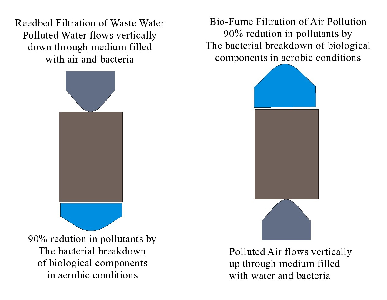 Bio-Fume Filter polluted air through a moist bed of organic medium full of bacteria. Bacteria efficiently breakdown fumes passing through the system. Our experience of Reedbeds demonstrates there is no better carbon filter than the living bacteria and carbonate/bicarbonates found in soils.